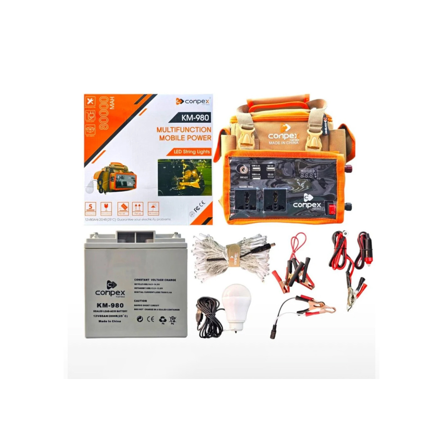 KM-980 MULTIFUNCTIONAL MOBILE POWER 12V 2 BULB & ROPE LIGHT WITH INVERTER